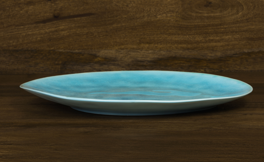 Turquoise large serving plate carved with a unique pattern and finished with a shimmery teal crackle glaze. Pure and simple. Clean Asian shapes have a thin, elegant feel and sophisticated color palette of subtle electric blue and cyan. Porcelain is fired at a very high temperature, with the cooling process creating the beautiful crackling of the glossy glaze. Ideal to make wonderful display bowls for holding fruit, pine cones or other dried plants.