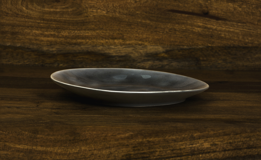 Medium, gray serving plate carved with a unique pattern and finished with a shimmery teal crackle glaze. Pure and simple. Clean Asian shapes have a thin, elegant feel and sophisticated color palette of subtle taupe and matte state gray. Porcelain is fired at a very high temperature, with the cooling process creating the beautiful crackling of the glossy glaze. Ideal to make wonderful display bowls for holding fruit, pine cones or other dried plants.