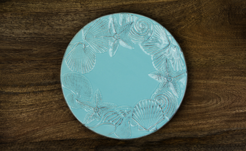 Beautiful seashell plates were created in a distressed style for a more casual, beach cottage placesetting. Celadon glazed cottage pieces have distressed edging, assorted, raised, embossed starfish dance around the rim.